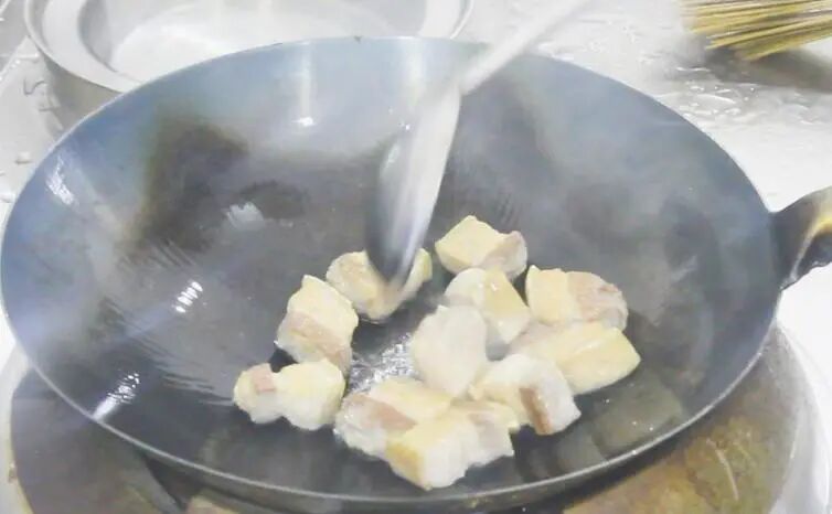 锅内放入少许油,下入沥干水分的五花肉,将五花肉的水分和油脂炒香,炒出油脂后将五花肉装出备用,这一步主要目的便是炒出油脂吃起来没那么油腻。