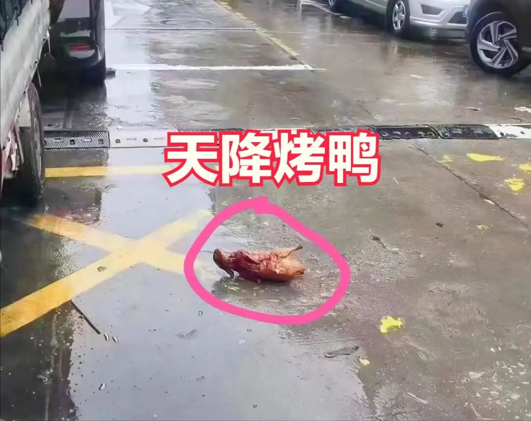 周末在家里休息,女朋友中午会过来吃饭,于是张铭轩一大早便冒着小雨去菜市场买菜,在邻近菜市场的路上,张铭轩看到路上不知是谁掉了一只烤鸭。