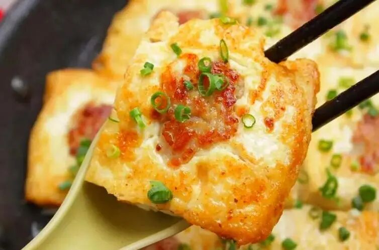 然后用勺子在豆腐上挖一个洞,将腌制好的猪肉放入豆腐里,锅内放入少许食用油,下入豆腐小火慢煎,有猪肉的那一面可以煎久一点,煎制两面金黄色时,便可加入生抽,蚝油进行调味,最后放入少许淀粉水,大火收汁。