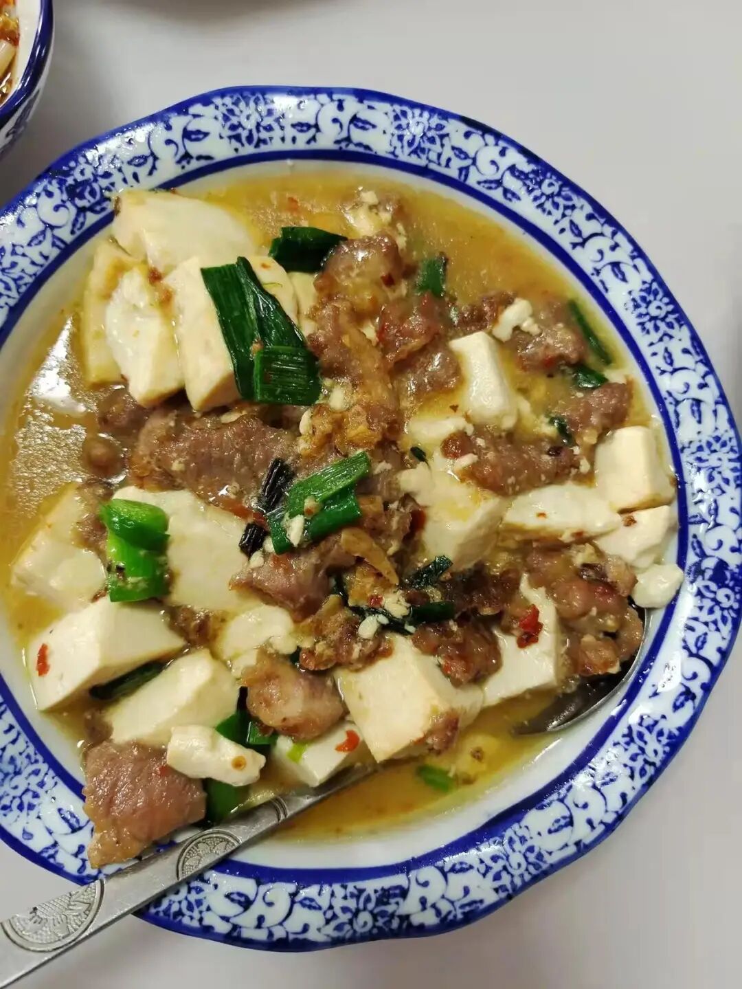 豆腐煎至金黄色时,翻面继续煎,然后下入腌制好的猪肉,放入生抽,蚝油等调味品,最后加入清水煮5分钟,撒入葱花大蒜一道特色豆腐烧肉就做好了。