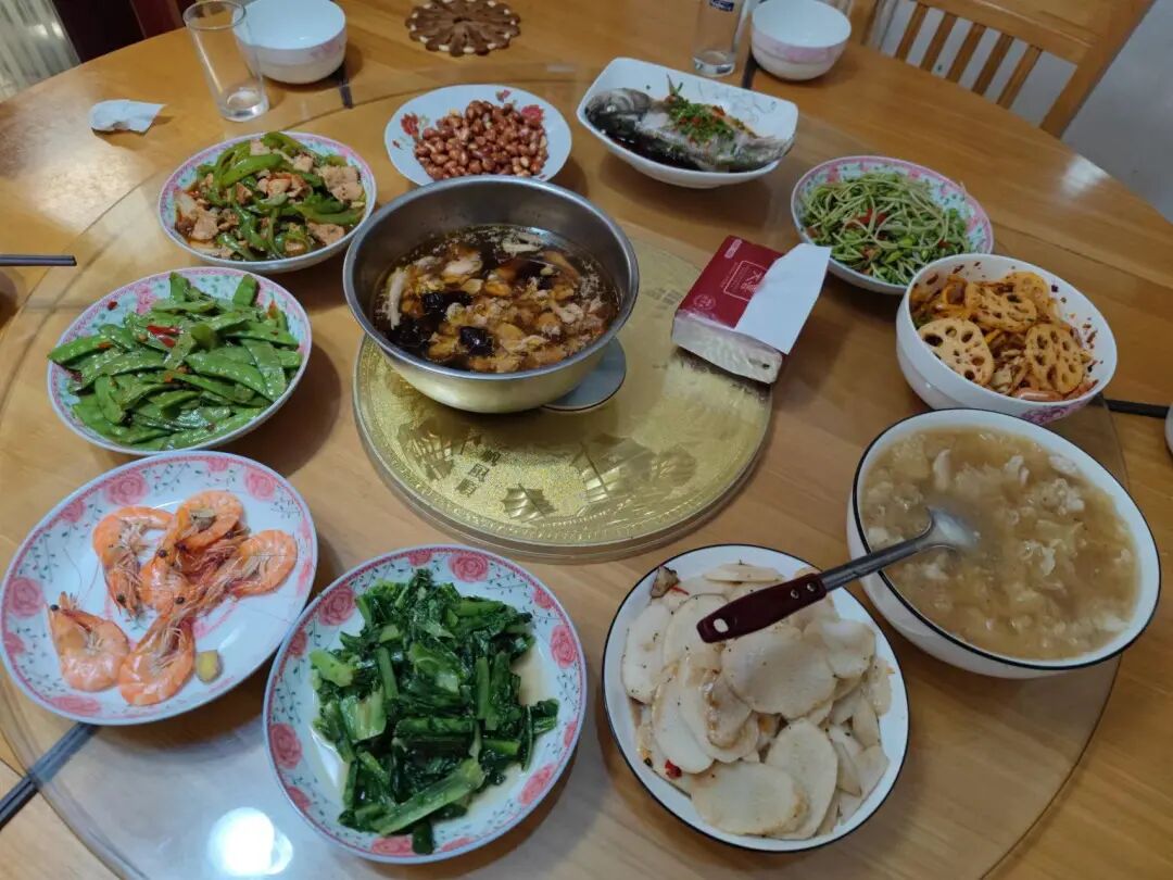 阿姨在厨房前后忙了3个多小时,做了一大桌子饭菜,8个人吃十菜一汤,菜品还是非常丰富的,阿姨很是热情,招呼张倩坐下来吃饭,端菜的事情不需要她帮忙。