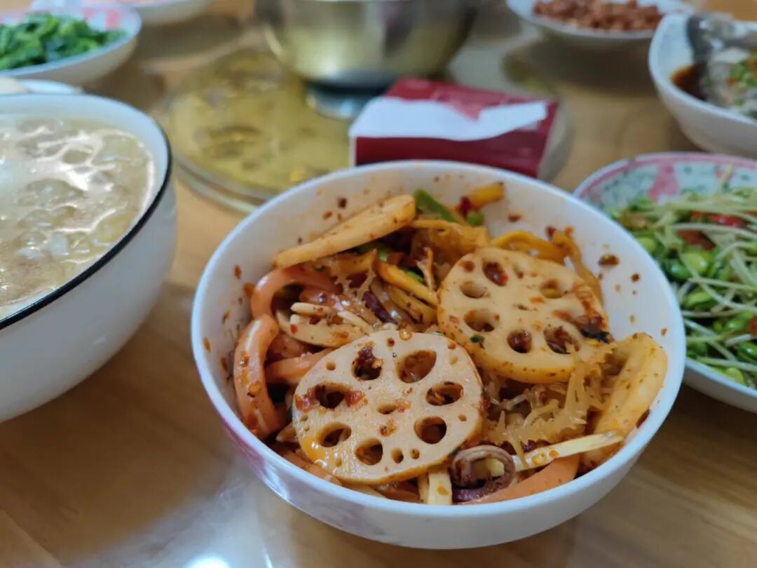 就连桌子上那碗张倩跟朋友去超市买的凉拌菜,打开后也是一股辣味扑鼻而来,莲藕,黄花菜,腐竹,黑木耳上面沾满了红色的辣椒粉。