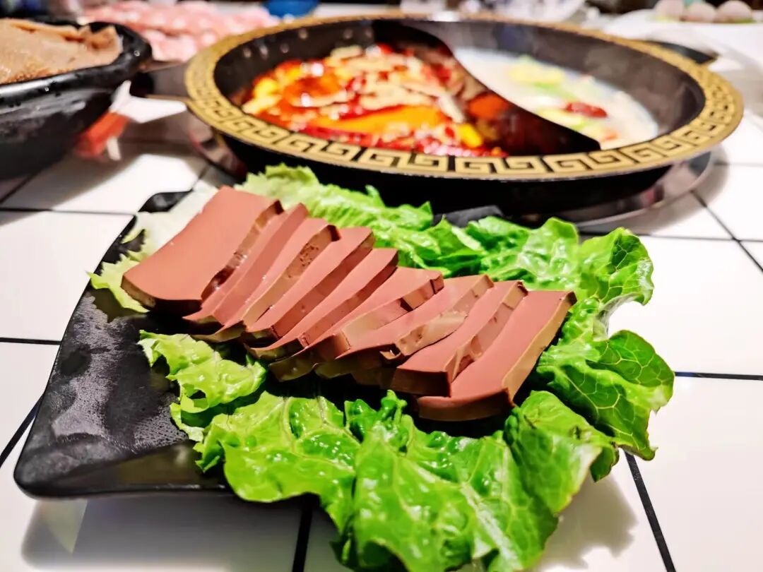 锅里没啥吃的了,陈海涛又将牛肉丸,鸭血,金针菇,土豆,生菜等菜品下入了锅中。