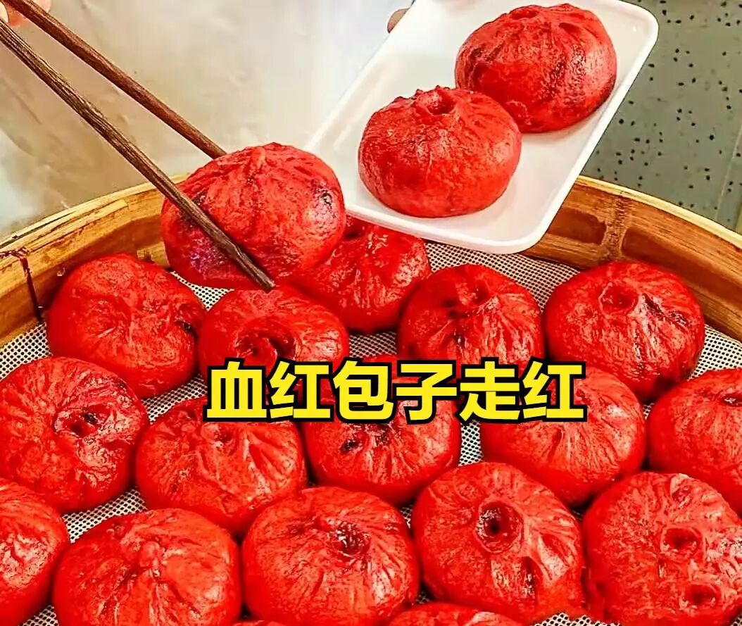 估计这家网红店老板正是看到了这样的描写,于是将白色包子做成了“血红”色,没想到一炮而红,吸引了很多顾客。