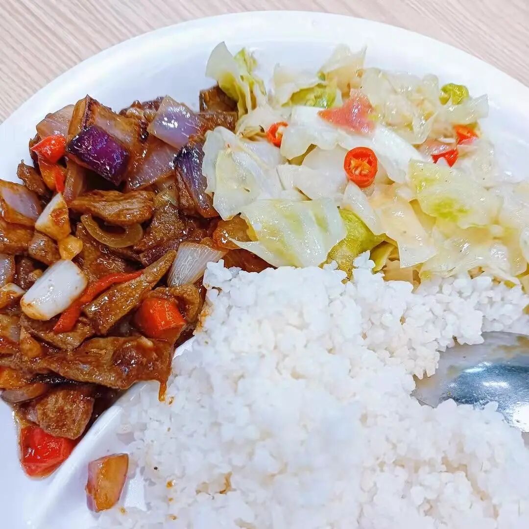 这是食堂厨师炒的腐竹烧肉,里面红色的并不是猪肉,而是辣椒,青色的也不是香葱,而是青椒,一道腐竹烧肉里,猪肉切得很小,几乎是看不见的,放眼望去的全是各种颜色的辣椒。