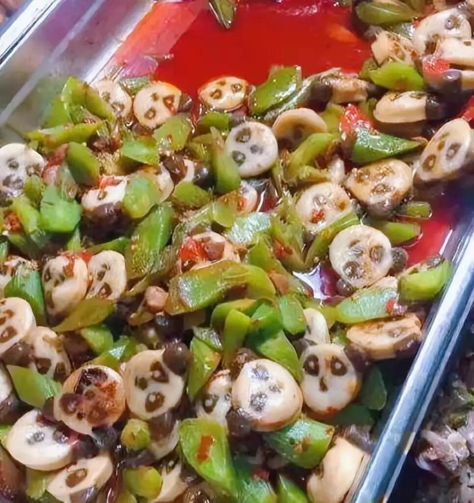 这是食堂的一道创意菜品,冰墩墩炒辣椒。