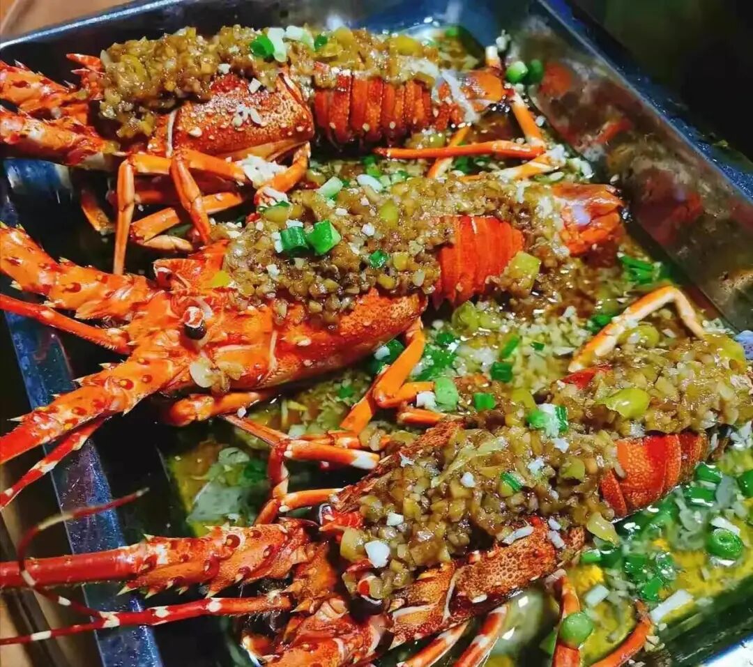 为了让大龙虾做得更好吃,表妹一边看美食博主视频,一边制作,先将龙虾清洗干净,然后切开肚子,在龙虾上面放入生姜末,蒜蓉,生抽,蚝油等各种配料,然后放入蒸锅中蒸10分钟。