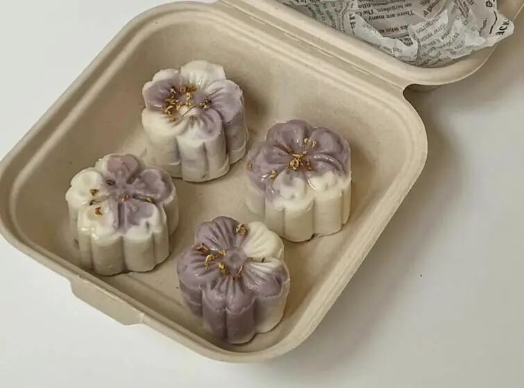 将山药面团和芋泥面团合二为一,一边是紫薯,一边是山药,然后将紫薯包裹在其中,用磨具按压成型,最后脱模后撒入桂花粉。