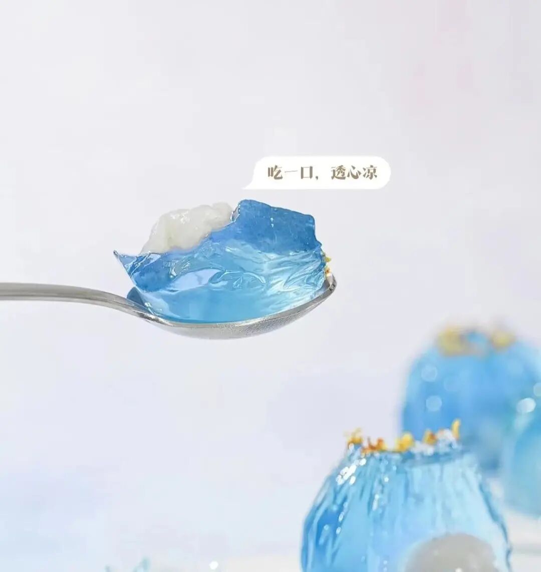 这道美食其实跟现代的果冻很类似,食小姐的制作方法是先将椰子水加热然后放入蝶豆花进去,再加入10克的白凉粉,烧开后关火,便能够制作出蓝色的汁水。