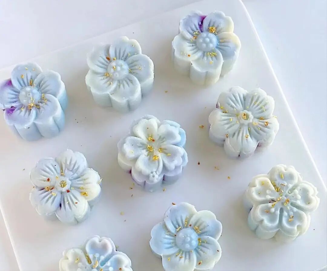 其中抹茶芋泥糕的颜值非常高,将山药,芋头用破壁机打成粉末,加入60g糯米粉,做成面团,然后将面团一分为二,其中一半加入少许抹茶,将面团合二为一,放入芋泥馅,包裹起来,然后用磨具按压成型。
