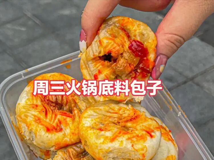走在路上,打开打包盒,发现包子表面呈现红色,拿出一个包子咬了一口,发现这个包子的口味居然是火锅底料的味道。