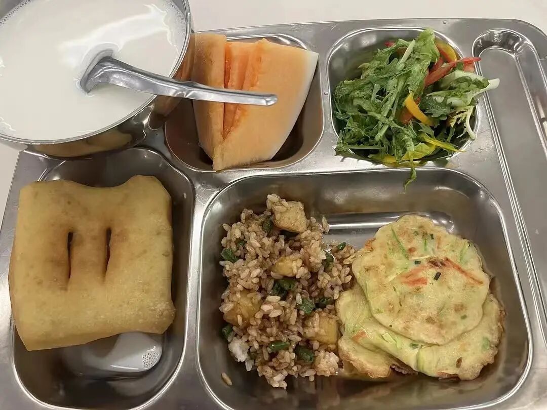 食堂里的水果也是无限量供应的,每餐食堂都会提供两种不同的水果供大家选择,西瓜,葡萄,李子,荔枝等夏季应季水果更是常见。