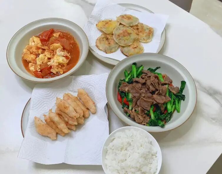 周三晚餐:西红柿炒蛋+馅饼+牛肉炒菜心+油炸小鱼干。