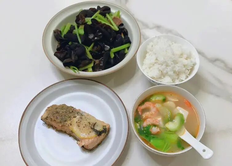 周五晚餐:清炒黑木耳+煎鱼片+虾仁豆腐汤。