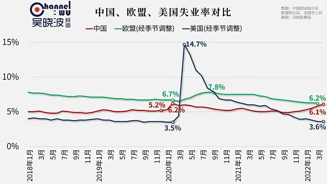 而同一时期,我们再看另一组数据,根据美国劳工部统计,美国4月份失业率在3.6%,4月份增加了43万个工作岗位,美国的失业率在疫情爆发之前为3.5%,现在只是略有上升。相比于美国,英国今年4月的失业率为3.7%,是自1974年以来的最低纪录,英国职位空缺达到了130万个,市场就业需求十分强劲。还有,法国、加拿大、韩国、日本的失业率问题现在都不严重,尤其是相比现在咱们中国。