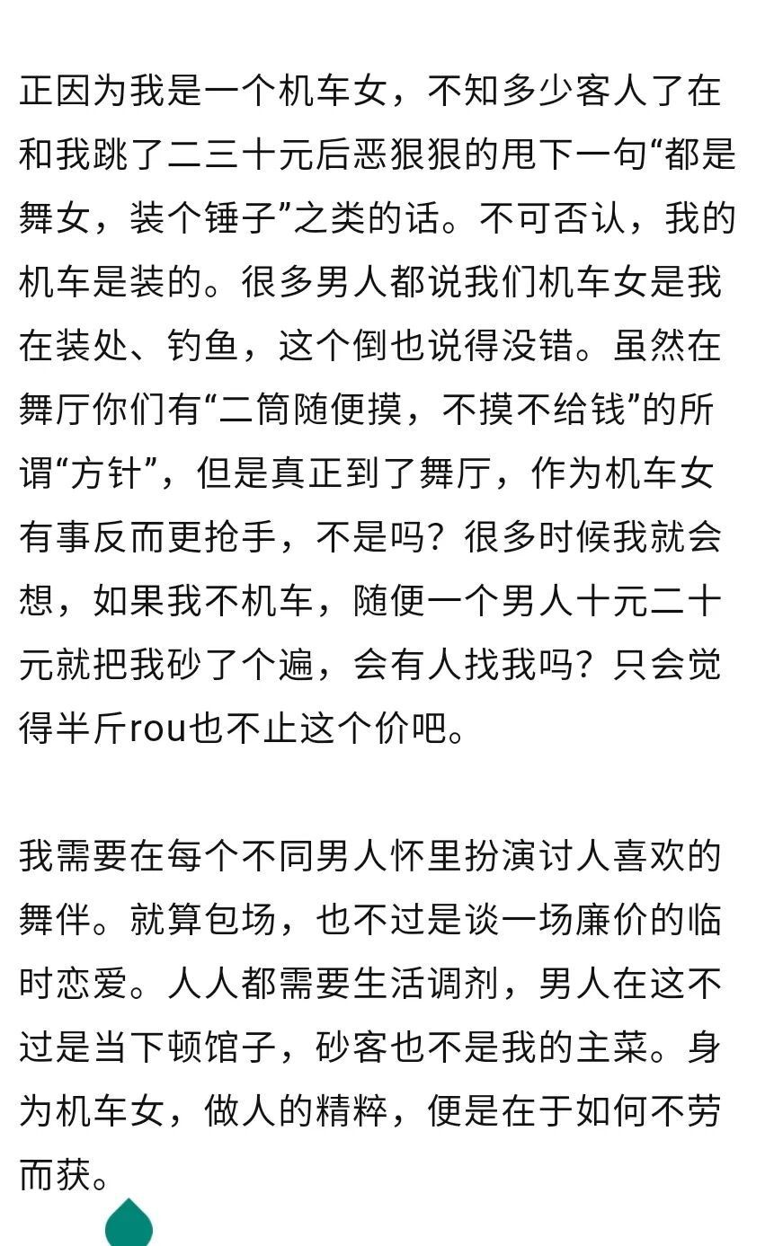 今天继续说一说,砂舞群里经常讨论的一个话题,机车女!许多舞客联系我时,都会问,什么是机车女,是不是喜欢骑摩托车的女孩呢?为什么这么多男性舞客都会讨厌机车女呢?其实不然,舞厅里的机车女指的是收了钱,装清高,不让碰的舞女们。舞客动作稍微大点,就会说,我不是那种随便mo的女孩子,把手拿开,请你注意素质。