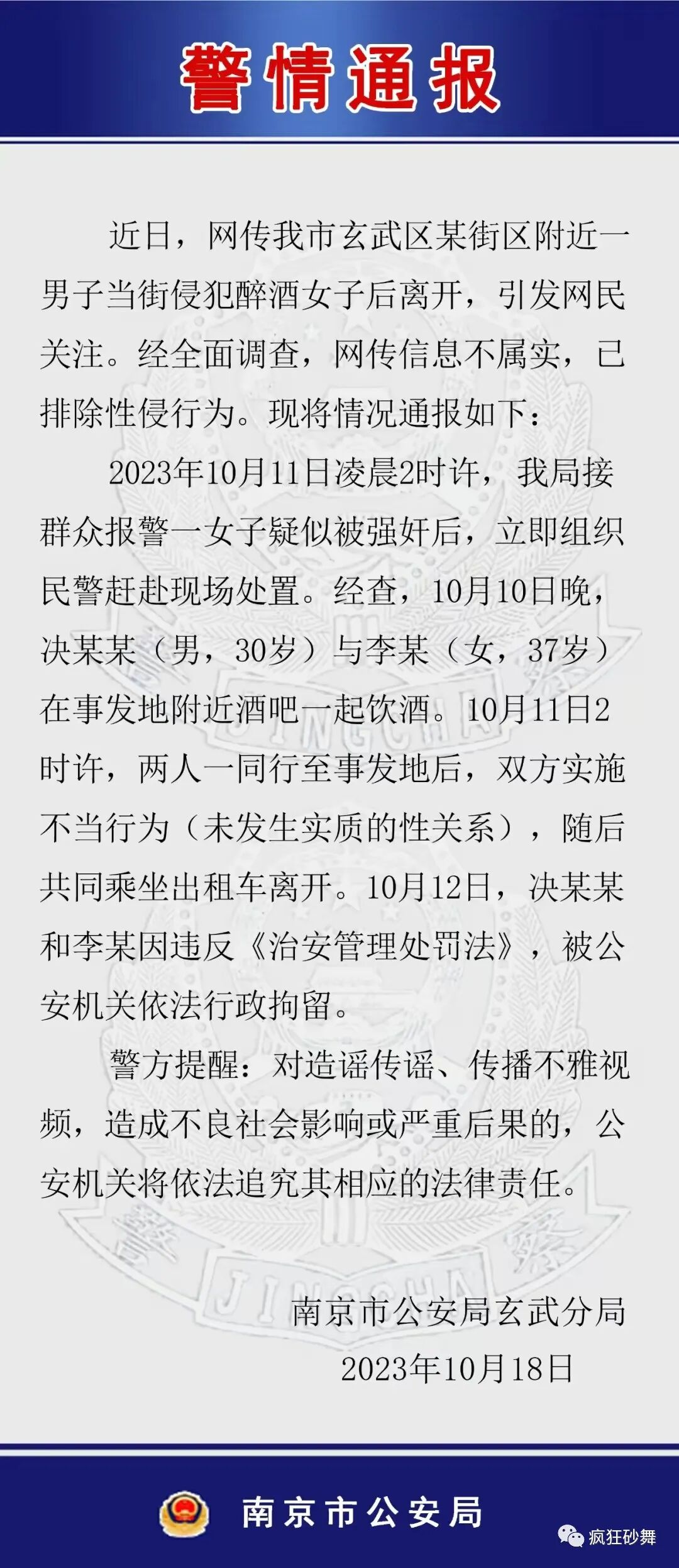 刚刚,南京玄武公安公众号发布一则警情通报,回应“醉酒女子当街遭侵犯”传言。