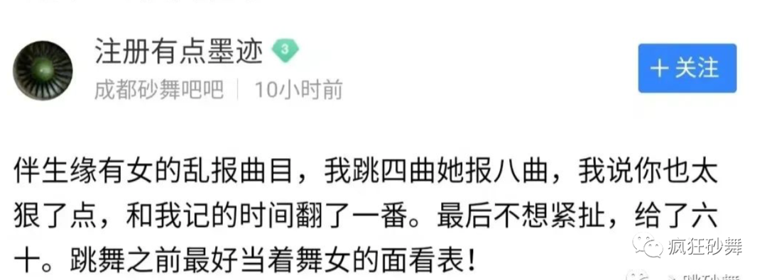 ♥近期成都舞厅被投诉乱收费,乱报曲目的事屡见不鲜,红虹舞厅,情浓,伴身缘都时有发生,很多人抱怨都是苏州舞女过来整的这种气氛,因为前段时间舞厅经常爆出苏州机车女,乱涨价,还特别能装,这是每个城市地区的市场气氛造成的,都乖苏州舞客惯坏了这些人,但是凡事必有因果,大家要注意好自己就行,跳舞的时候看下时间,问清曲目价格,别被套路!
