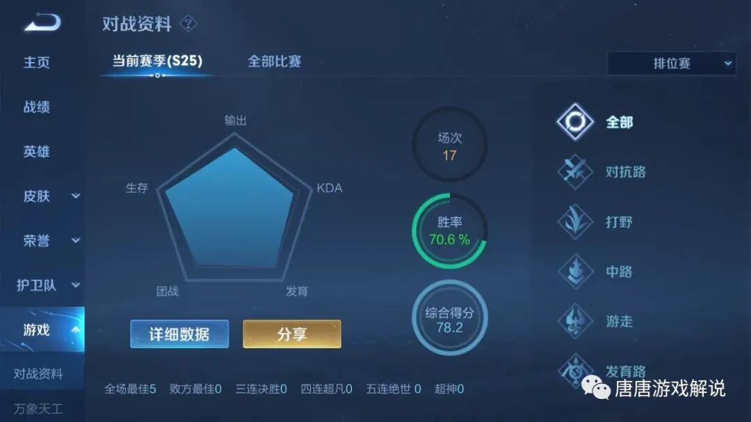 当段位达到最强王者,一般情况下这是比较简单的,然后就可以开始进行卡分的操作了,巅峰赛开启之后平时不要玩,去匹配苦练英雄就行,等周末的挑战赛开启之后再使用自己的拿手英雄!这时候玩巅峰赛的玩家为了英雄战力都会比较用心玩,这时候得到足够休息完全能发挥更强的实力,通过挑战赛的加成快速提升巅峰战力,这时候再看自己的战绩就会发现,包括匹配、排位和巅峰赛的整体胜率接近50%,但后面两种胜率却会更高,这样一来可以快速提升巅峰积分和段位的同时,还不用每天都去排位赛受气。