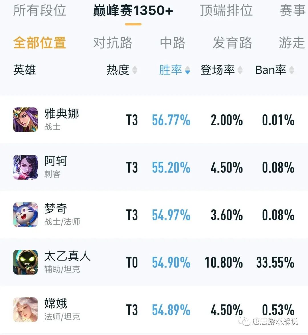 一般情况下,巅峰赛1350的数据比较具备参考价值,因为所有段位数据存在许多练英雄之类的可能,而顶端排位则是完全靠实力让英雄表现获得更多可能,且玩家数量也会更少一些。