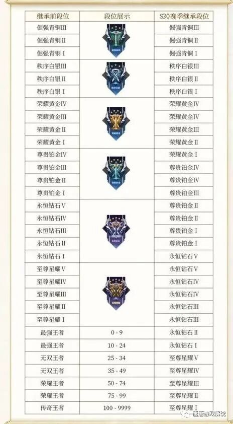 段位继承方面:与S29赛季没有变化,最强王者24星及其以下的玩家,大都会继承到永恒钻石段位,作为每个赛季初最鱼龙混杂的段位,也是公认体验最差的的段位,因此S29赛季建议提升到王者25星,就可以继承到星耀段位。