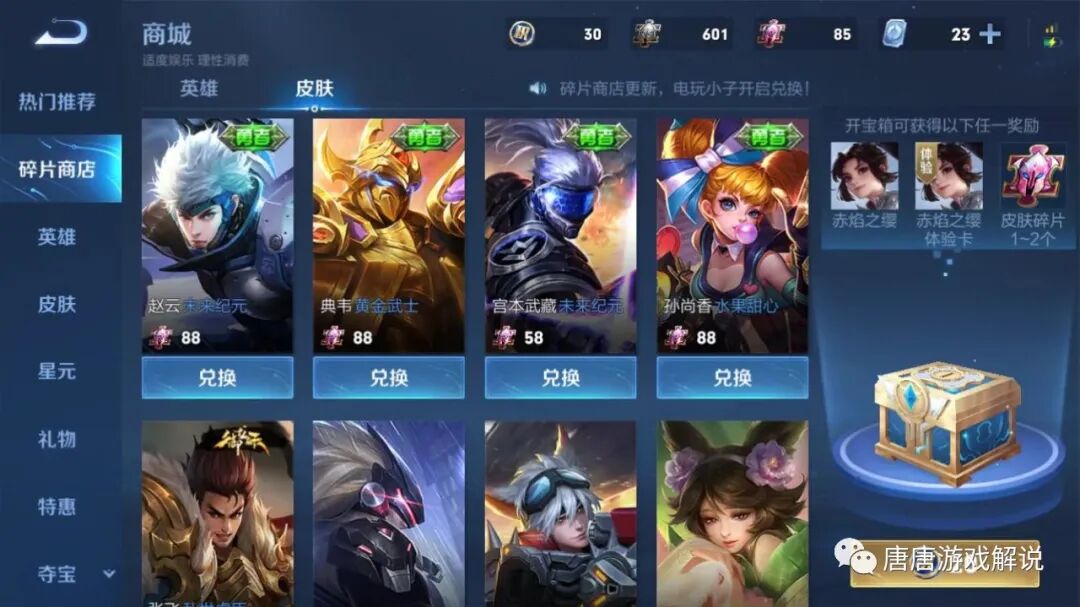 在目前的游戏设定中,获取皮肤碎片的渠道很丰富,比如荣耀战令系统中只要就可以兑换,开启皮肤盒子的时候也有得到碎片的机会,但能获取的数量有限!除此之外周末的时候,战队赛获胜之后得到的道具也可以兑换皮肤碎片,每个赛季可以兑换的上限足够使用,如果以上两个方法依旧无法凑齐碎片,还可以试试临时点券。