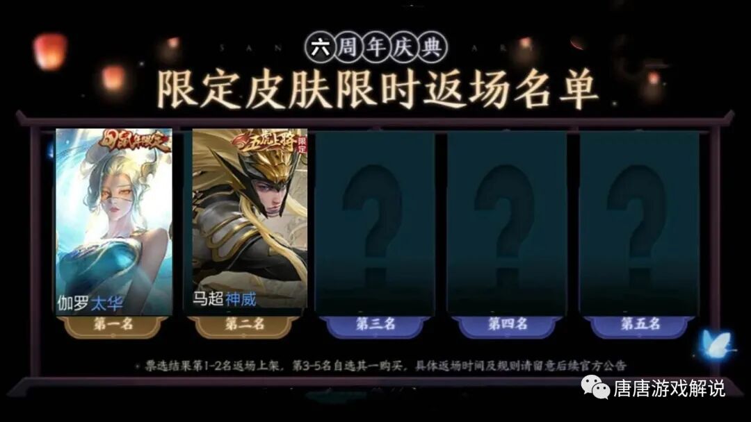 在庄周新皮肤上架的同时,后续还会有总计七款限定皮肤返场,首先就是这次的投票返场皮肤,前两名基本确定为伽罗的太华和马超的神威,胜过其他皮肤太多。除了这两款皮肤之外,还可以从第三到第五名的皮肤中任选一款,最终的结果会在下周揭晓,返场时间则设定在周年庆正式开始之后,持续五天时间到11月1日就结束。