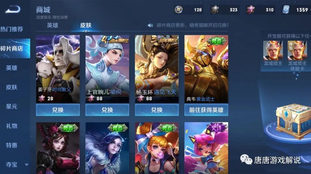 曾经的周年庆皮肤返场时,就曾经放进碎片商店中,这相比其他限定皮肤性价比就更高了,可惜的是今年投票返场的很多皮肤太受欢迎,导致这类皮肤没返场机会!有玩家可能还会面临另一个问题,没有充足的时间攒皮肤碎片,从目前游戏中的设定来看,战队赛商店、荣耀战令系统都可以兑换不少碎片,若还不够也还有办法。