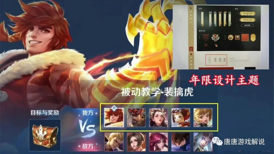 相比“探幽”系列皮肤,每年必定有的春节限定距离玩家们会更近一些,由于保密工作做得很好并没有透露太多的信息,但依旧可以从中得到一些有用的东西,从而推断出虎年限定皮肤的归属。在体验服中已经出现了虎年限定的回城特效,而新的被动教学中又有一个很有趣的内容,裴擒虎、廉颇、杨玉环、鲁班七号和孙膑,组成一个不那么常见的队伍,其中杨玉环确定有新皮肤!
