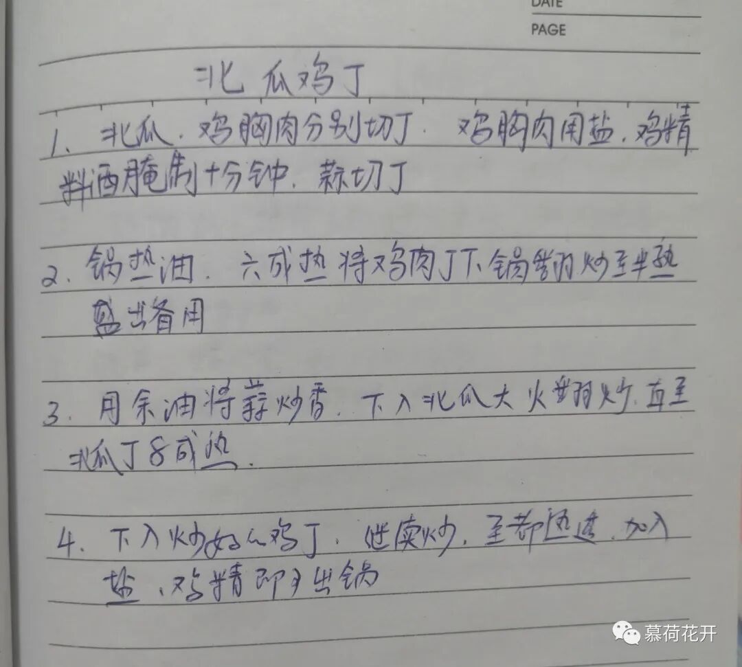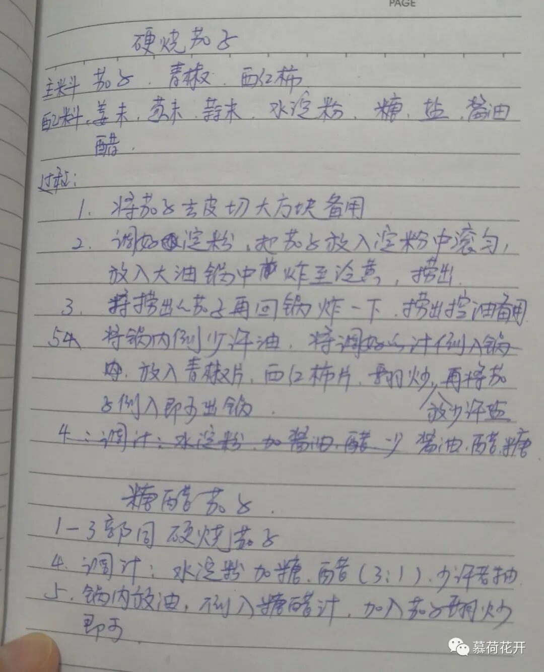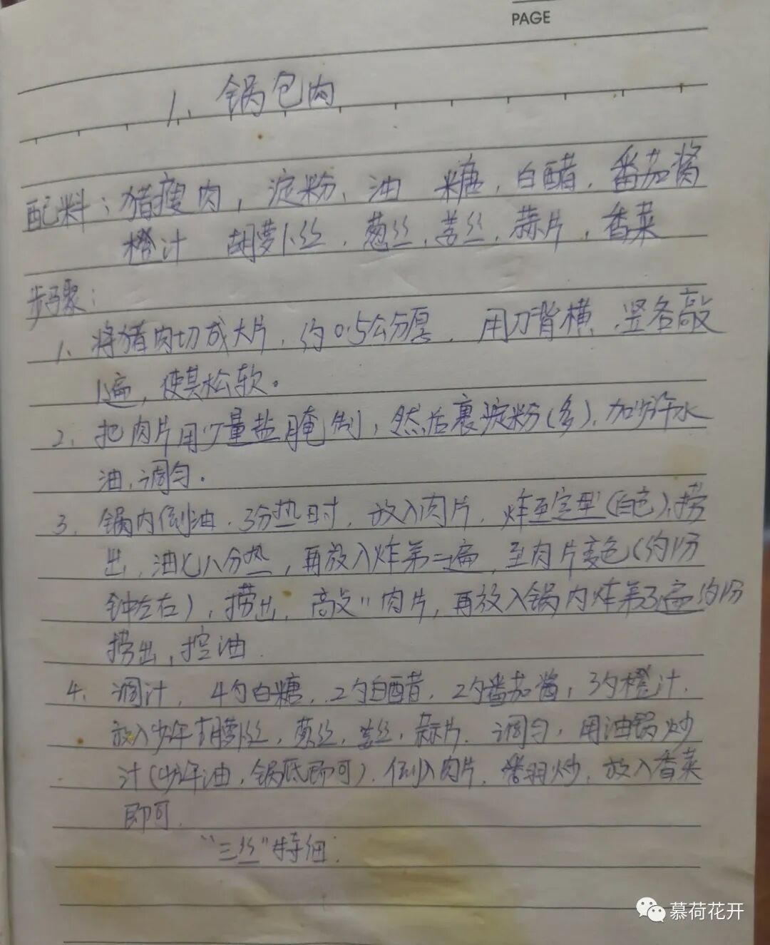 清楚地记得我学做的第一道菜叫“锅包肉”,据说是一道东北名菜。我准备了笔和本子,详细地记下了食材和做菜流程:肉要切成稍厚一点的片,然后用刀背把肉横竖各拍打一遍,再裹上淀粉下锅炸,需要先后炸两遍定型。调汁待用,最后烹炒收汁出锅即成。我把本子放在灶台边上,一步步地按照“指示”操作,儿子巴巴地跟在我屁股后边,期待着“美食”上桌。等我大汗淋漓、浑身油烟味儿地把一盘锅包肉端上餐桌的时候,一个多小时已经过去了。