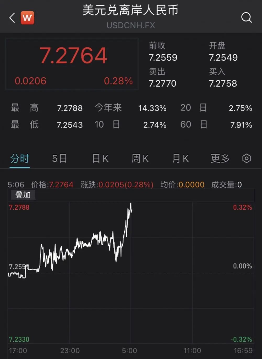 2022年10月19日,随着美元指数显著走高,离岸人民币兑美元汇率自7.22至7.27接连走贬,盘中一度跌至7.2741,收盘于7.2648,日内贬值幅度为0.64%。由于结汇盘对人民币仍有支撑,因此随后趋于缓和,20日收复7.26关口。21日再度跌破7.27关口,截至18:00,最低至7.2788。