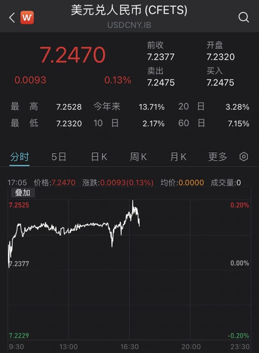10月21日,人民币对美元即期汇率盘中接连跌破7.24和7.25两个关口,16时30分日间收盘报7.2494,较上一交易日跌117个基点。这一收盘价突破了本轮人民币对美元汇率贬值的前期低点(9月28日收盘报7.2458),创下了2008年1月中旬以来的新低。