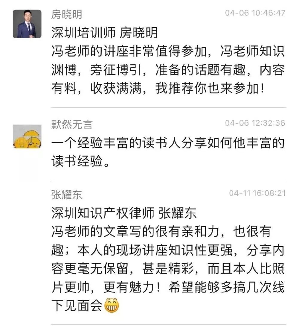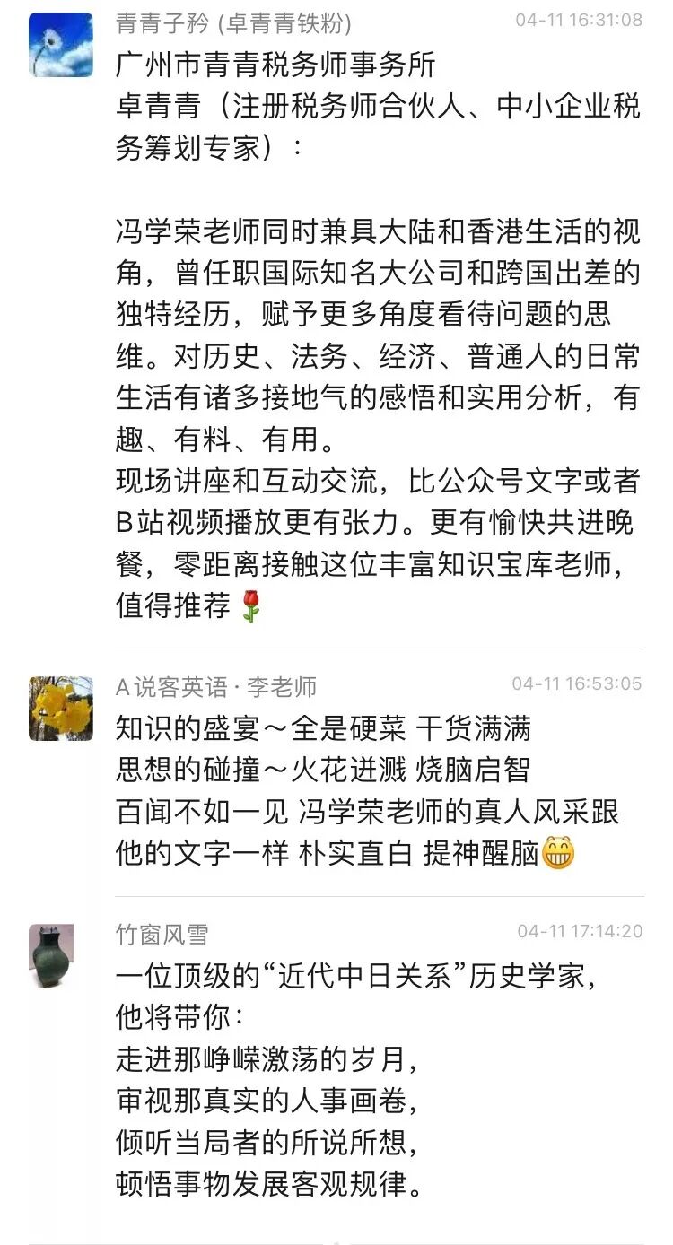 收获一:老冯分享两个小时知识盛宴,包括从大视野解读中国历史的过去、现在和未来,以及历史对我们人生和事业的启发和警示,同时也分享老冯本人在职场、创业、读书、写作、投资等方面的有趣经历。