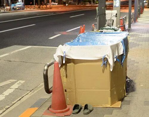 日本的流浪汉,喜欢用一些特大号的硬纸皮,例如装冰箱的那种大纸盒的皮,左缝右缝,好多块纸皮拼起来,拼成一个正方体或者长方体的“纸皮屋”,而且他们的“纸皮屋”还有门,他们的鞋子,还摆在门外,也就是说,日本的流浪汉,他的“纸皮屋”还挺整洁的,没有明显的臭味,周边也几乎看不到什么垃圾,真是做到了“我流浪也讲卫生,流浪也不给社会添麻烦。”真是服了他们。