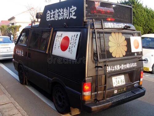 一天白天,我在东京六本木,见到了一辆右翼宣传车,是一辆面包车,架着高音喇叭,车内两个人,一个负责开车,另一个负责用麦克风高喊口号,车身上飘着几面标语,写着四个汉字:“尊皇敬神”。