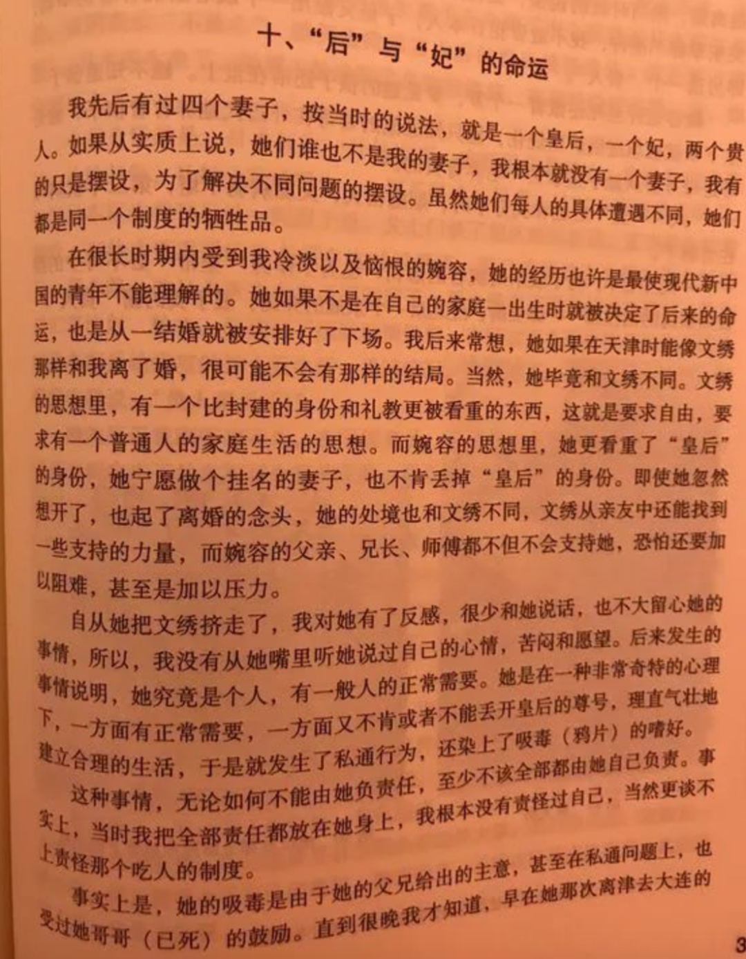 “后来发生的事情说明,她究竟是个人,有一般人的正常需要。她是在一种非常奇特的心理下,一方面有正常需要,一方面又不肯或者不能丢开皇后的尊号,理直气壮地建立合理的生活,于是就发生了私通行为,还染上了吸毒(鸦片)的嗜好。这种事情,无论如何不能由她负责,至少不该全部由她自己负责。事实上,当时我把全部责任都放在她身上,我根本没有责怪过自己,当然更谈不上责怪那个吃人的制度。”