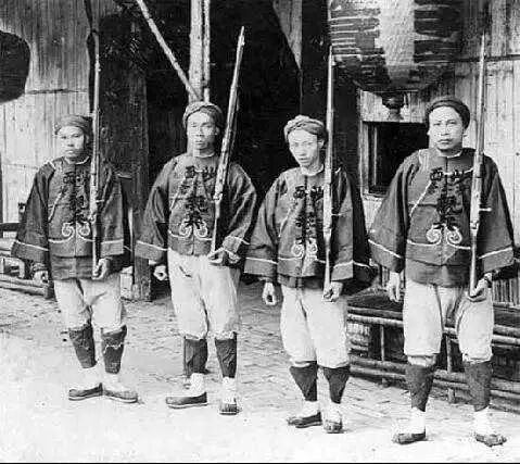 然而实际上,绑腿这件事,也并不是民国时期的发明,早在古代的战场上,许多战斗部队已经学会绑腿,以下这幅附图,是清代某地官兵的老照片,我们可以看到,清兵也知道绑腿,其目的和动机,和我们刚刚列明的这些,其实都是一样的。