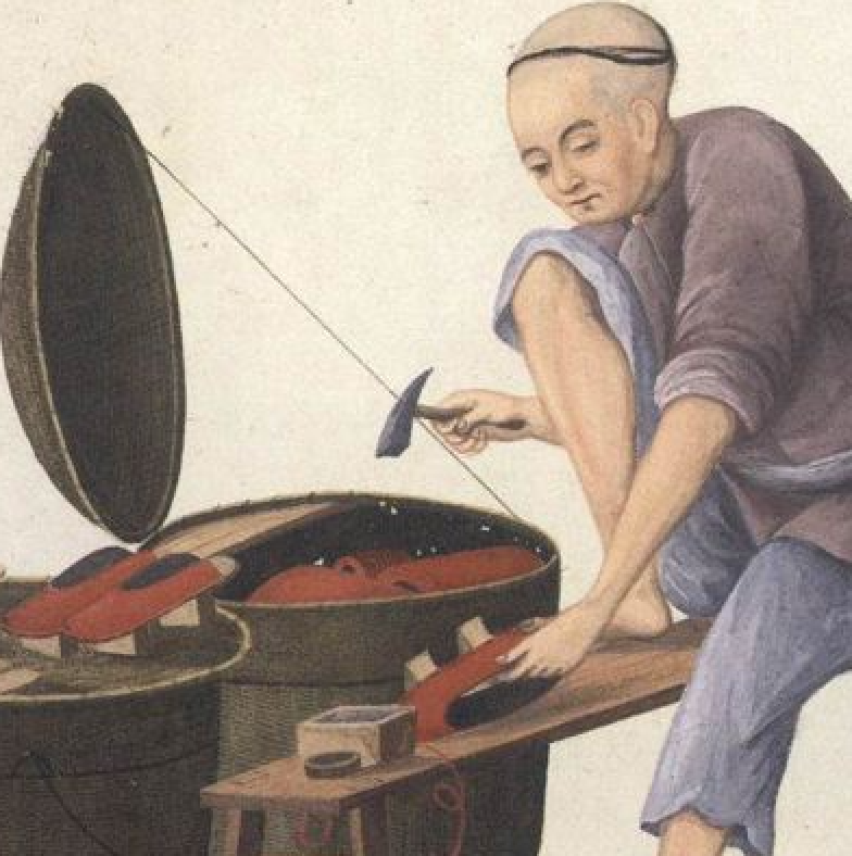缠了小脚的中国女人,只能把她那双三寸金莲,套在小小的迷你绣花鞋里,显然,再也穿不了木屐了。