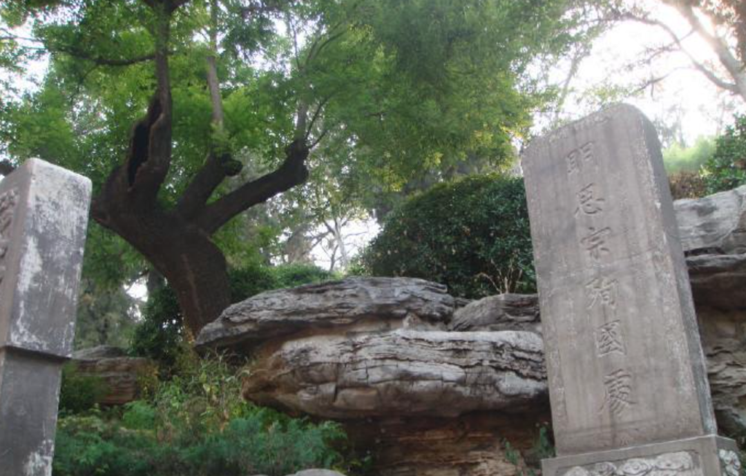尾声:崇祯皇帝吊死的那颗老槐树,在皇帝死后,它又活了300多年,看尽人世沧桑,然而,1971年,北京市园林局将这棵老槐树砍了。1981年,景山公园管理处觉得“明思宗殉国处”缺少了崇祯皇帝上吊的槐树,总好像缺了点什么,于是,在景山南边的山坡上,找了棵小槐树,把它移栽到老槐树的原处。可是,小槐树太小,看着别扭。于是,1996年,公园管理处从东城区找来一棵150多年树龄的老槐树,把它移栽到这里,替换了那棵小槐树。这棵150多年树龄的老槐树,就是我们今天在景山公园“明思宗殉国处”看到的这棵。