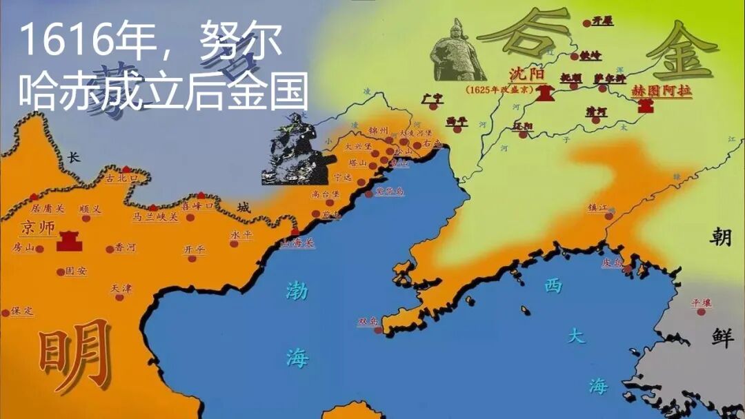 1616年,努尔哈赤在赫图阿拉(今辽宁抚顺市新宾县)成立后金国。
