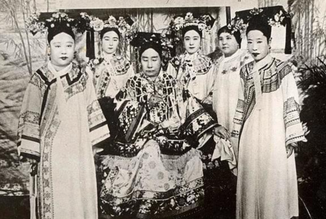 左一为瑾妃,左二为德龄,中间为慈禧,右三为容龄,右二是容龄和德龄的母亲(法国人),右一为光绪皇帝的老婆隆裕太后