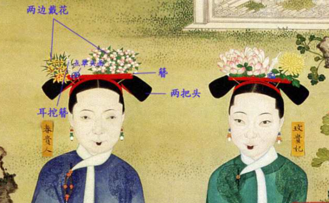 在乾隆年代,满清女贵族的头饰,是较为简单的,最典型的是以下这种,叫“两把头”。