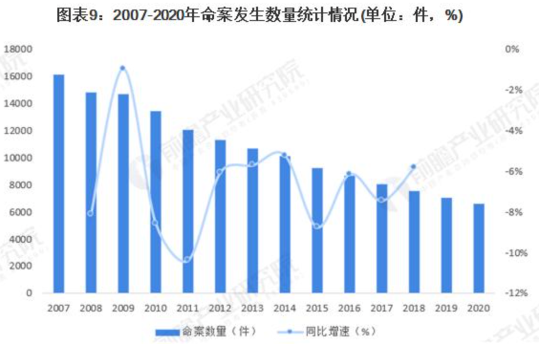 事实上其他地区,例如中国大陆,也是这个规律,下面这个图,是2007年到2020年中国大陆每年命案数量统计表: