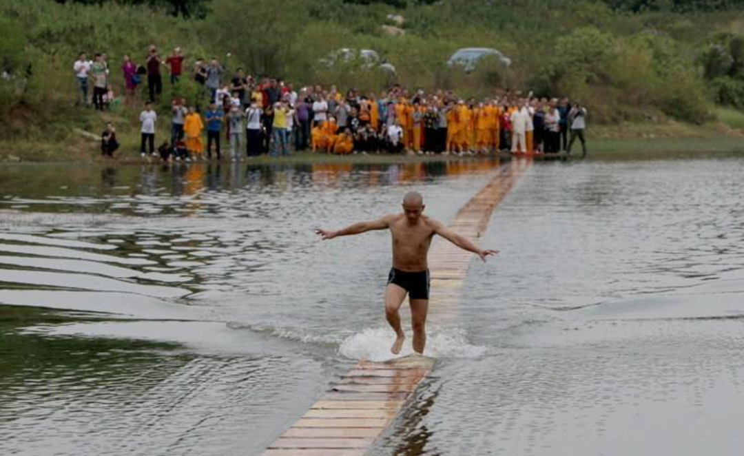 中国武僧表演“水上漂”,需要借助浮桥做道具,不可能凌空飞行