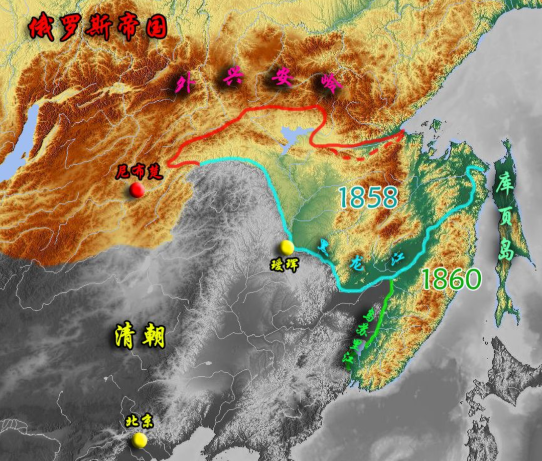 然而一百多年之后,认为俄国在《尼布楚条约》中吃亏了的俄国人子孙,又回来了,他们利用清政府的外交危机,通过《瑷珲条约》和中俄《北京条约》等,吞并了大清的大片领土,这个事大家都知道,我就不细说了,如下图: