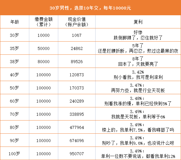 10年缴费则是第8年回本,时间虽然长了一年,但却最合适,尤其适合尚在奋斗期积累资产的中年人。