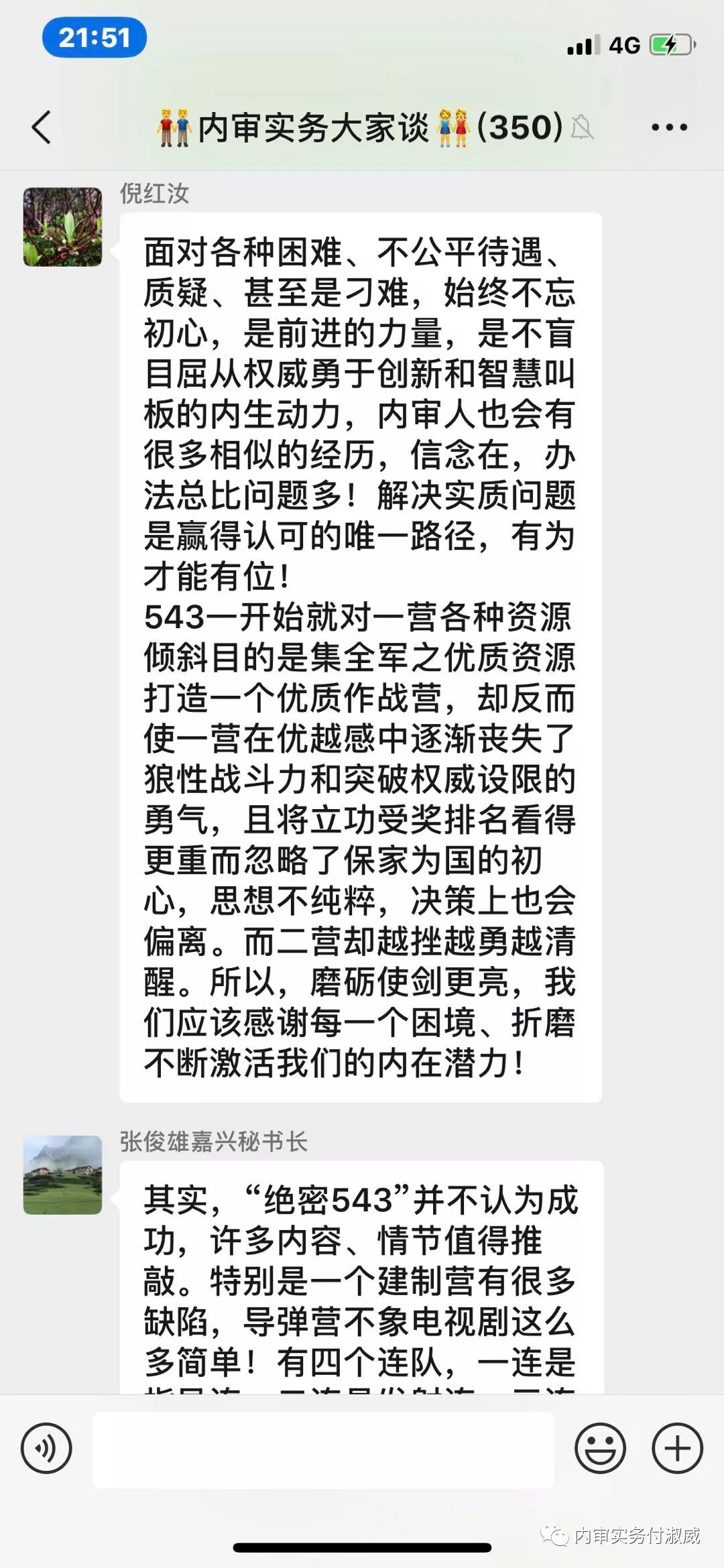 倪红汝(**集团审计部长):面对各种困难、不公平待遇、质疑、甚至是刁难,始终不忘初心,是前进的力量,是不盲目屈从权威勇于创新和智慧叫板的内生动力,内审人也会有很多相似的经历,信念在,办法总比困难多!业绩是赢得认可的唯一路径,有为才能有位! 543部队一开始就对一营各种资源倾斜目的是集全军之优质资源打造一个优质作战营,却反而使一营在优越感中逐渐丧失了狼性战斗力和突破权威设限的勇气,将立功受奖排名看得更重。而忽略了保家为国的初心。而忽略了保家为国的初心,思想不纯粹,决策上也会优柔寡断。而二营却越挫越勇越清醒。所以,磨砺使剑更亮, 我们应该感谢每一个困境、折磨挑战会不断激活我们的内在潜力!挫折来了,告诉自己,太幸运了,我成长的机会来了!