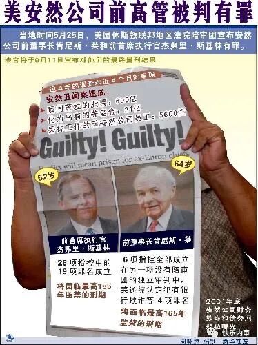 依据萨班斯法案安然的前首席执行官杰弗里·斯基林(J.Skilling)、安然的创始人肯尼斯·雷依(K.Lay)被起诉,被宣判有罪,分别获185年和165年监禁。