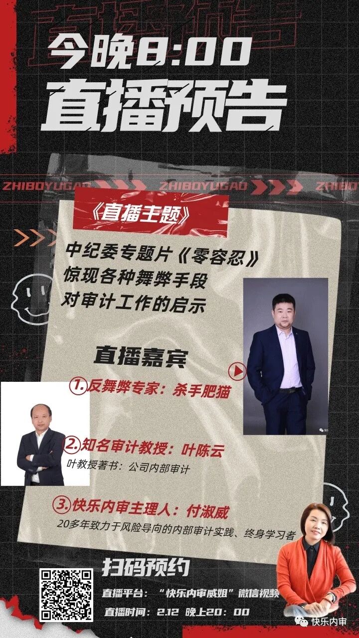 今晚“快乐内审威姐”微信视频直播,我们邀请了著有《公司内部审计》等多本精彩书刊的业界知名教授叶陈云;反舞弊专家杀手肥猫等大咖倾情分享。敬请期待!