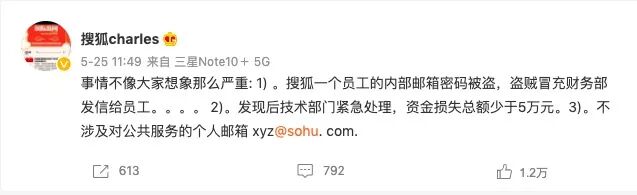 5 月 25 日午间,搜狐 CEO 张朝阳发微博回应称,事情不像大家想的那么严重。他表示,事件起因是搜狐一个员工的内部邮箱密码被盗,盗贼冒充财务部发信给员工。公司发现后,技术部门紧急处理,资金损失总额少于 5 万元。